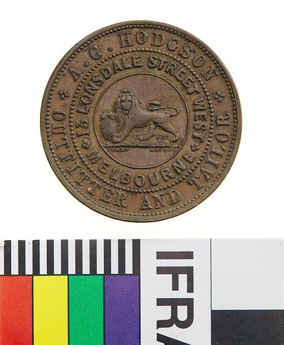 A round copper token (28 mm diameter) giving the name address and business of the issuer: A.G. Hodgson 13 Lonsdale Street West, Melbourne outfitter and tailor. The token features at centre of the obverse a male lion standing to left with head crowned facing front, its right paw is raised and rests on a shield bearing the Union Jack, its tail curved back over its body. On the reverse a female figure representing Justice seated on a wool bale with legs to left but her head and upper body to front. A wine barrel lies on the ground behind her, its end decorated with a cross in single incuse lines to hint at a Union Jack (as found beside Britannia on the copper coins of the period). A three-masted sailing ship sails to the right on the horizon to the left. Justice wears a blindfold and extends a balanced set of scales with her right hand. With her left she holds an inverted cornucopia from which fruits flow onto the ground. She wears an ancient-style of flowing dress bound at the waist, her left arm bare and right draped to near the elbow. It bears the date 1860.