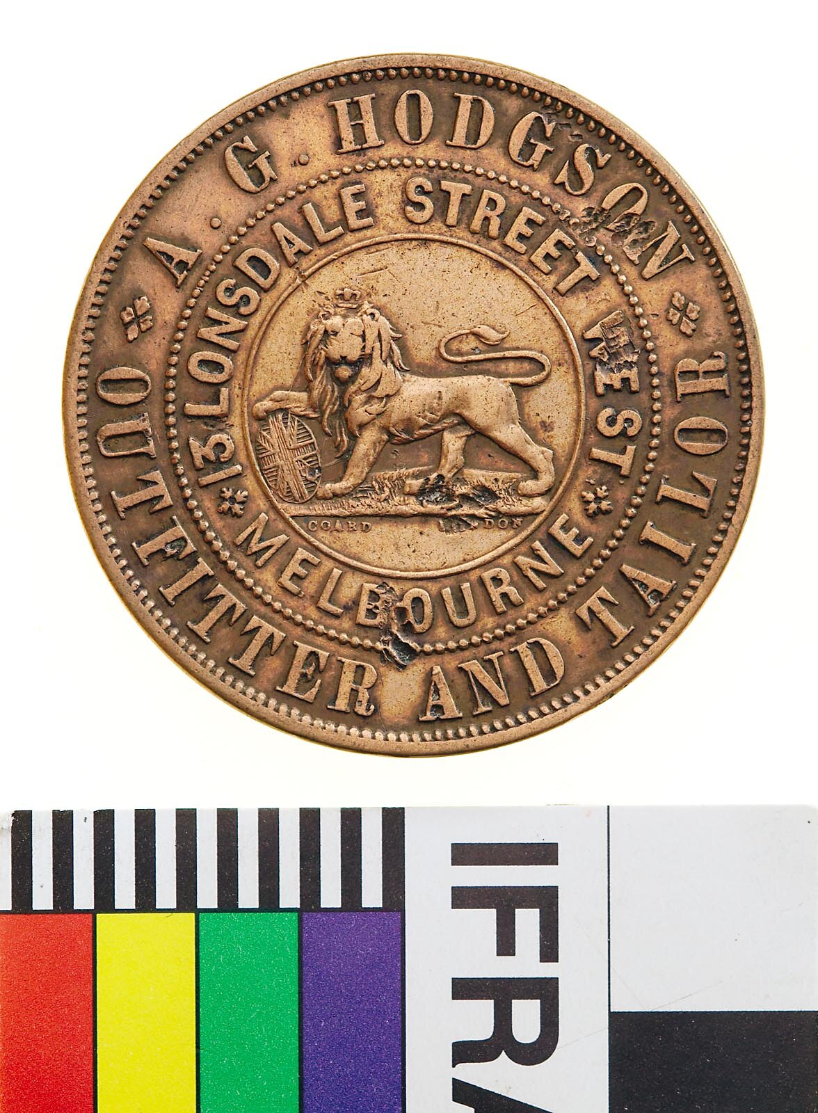 A round copper token (34 mm diameter) giving the name address and business of the issuer: A.G. Hodgson 13 Lonsdale Street, Melbourne outfitter and tailor. The token features at centre of the obverse a male lion standing to left with head crowned facing front, its right paw is raised and rests on a shield bearing the Union Jack, its tail curved back over its body. On the reverse a female figure representing Justice seated on a wool bale with legs to left but her head and upper body to front. A wine barrel lies on the ground behind her, its end decorated with a cross in double incuse lines to hint at a Union Jack (as found beside Britannia on the copper coins of the period). A three-masted sailing ship sails to the right on the horizon to the left. Justice wears a blindfold and extends a balanced set of scales with her right hand. With her left she holds an inverted cornucopia from which fruits flow onto the ground. She wears an ancient-style of flowing dress bound at the waist, her left arm bare and right draped to near the elbow. It bears the date 1860. This token has been cleaned and the reverse has begun to re-tone.