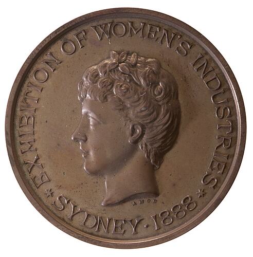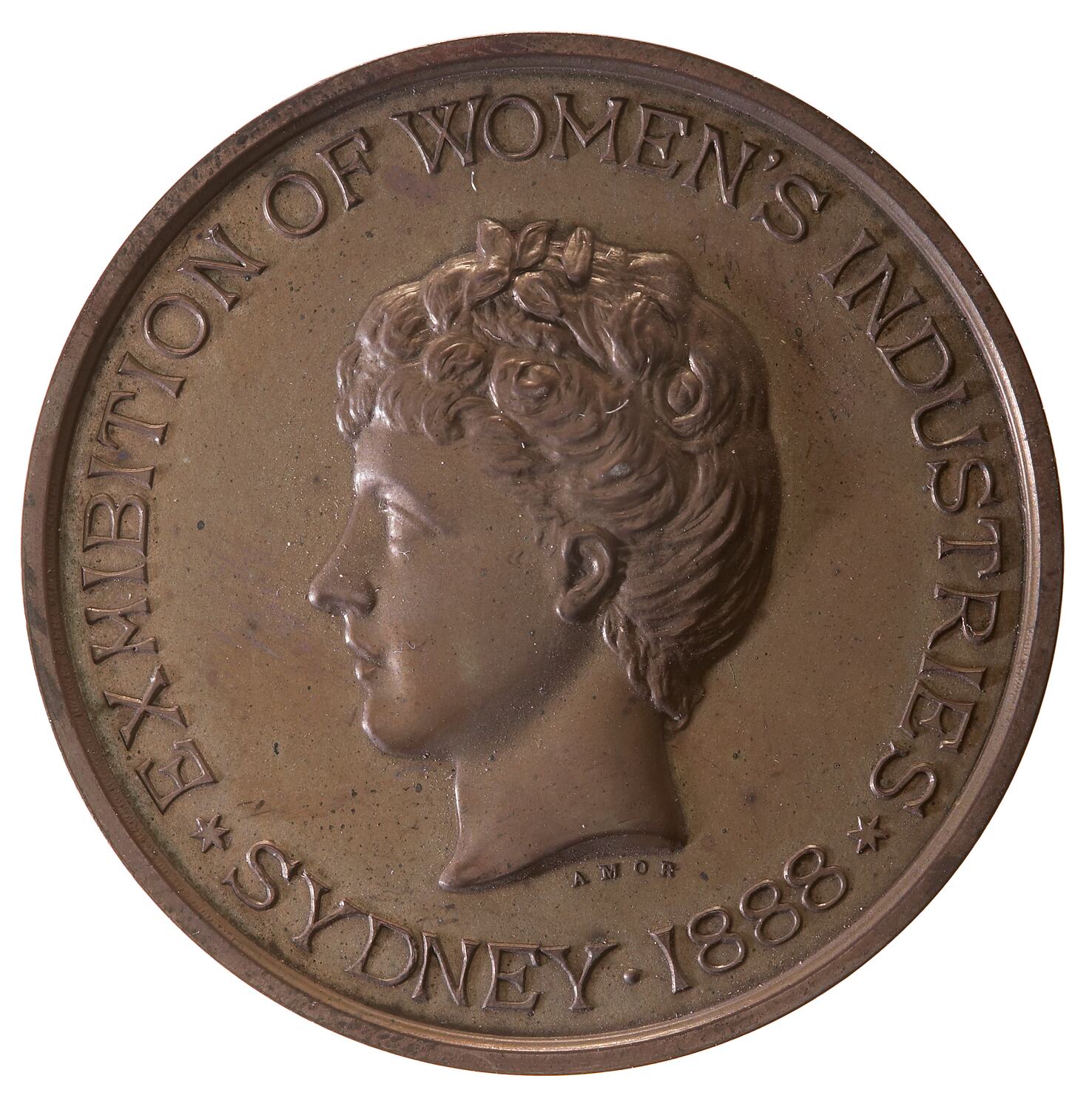 At centre a profile head of a young woman facing left; around, EXHIBITION OF WOMEN'S INDUSTRIES * SYDNEY . 1888 * ; the artist's and mint name AMOR under neck truncation.