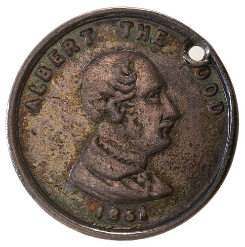 Bust of Prince Albert facing right , around, ALBERT THE [G]OOD 1851 holed through G of GOOD