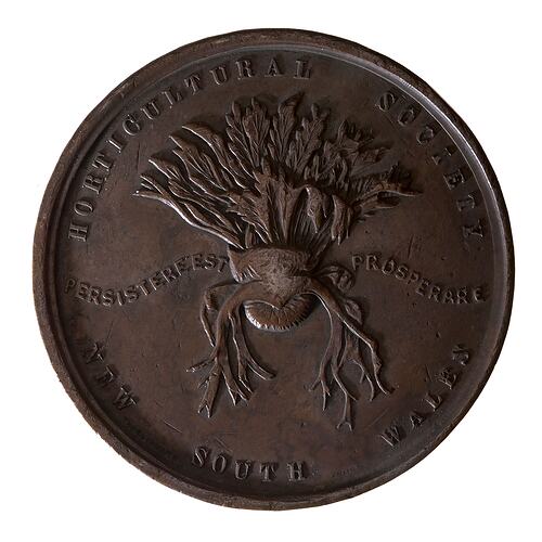 At centre a Staghorn; around, HORTICULTURAL SOCIETY NEW SOUTH WALES; across PERSISTERE EST PROSPERARE; in small letters on either side of the word SOUTH, THORNTHWAITE SYDNEY