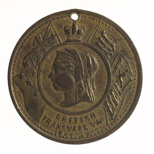 Edge: Plain Obverse: BRITISH / TRANSVAAL WAR / 1899 - 1900 Reverse: IN / COMMEMORATION / OF / PEACE / BRITISH - BOER / WAR / "LEST WE FORGET"