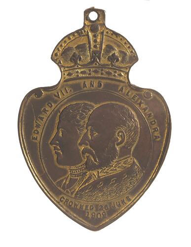 At centre, within line circle conjoined busts of Edward VII and Queen Alexandra; around, EDWARD VII AND ALEXANDRA 0; below, CROWNED 26 JUNE / 1902. Struck on a shield shaped flan with a crown and loop at the top