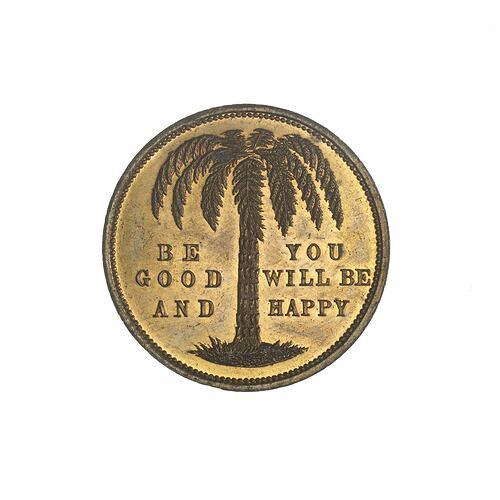 Medal, Cole's Book Arcade, Federation of the World, Be Good and You Will Be Happy, circa 1885. This gilt medal is one of a series of medals offering maxims and proverbs issued by E.W. Cole at his Book Arcade. He called the medals 'little missionaries for the spread of educative knowledge' (Dean, 1988, p.36).