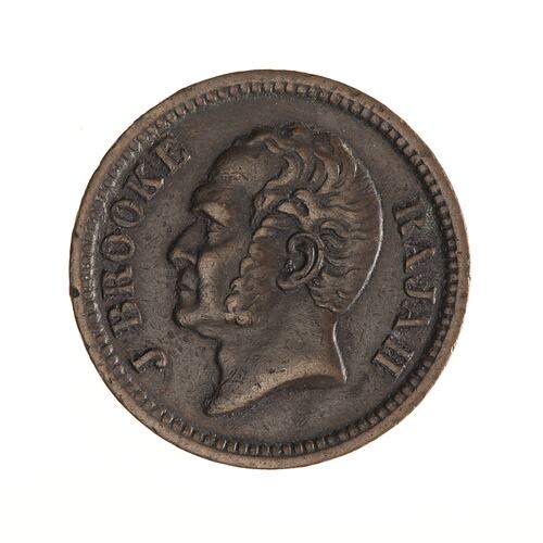 James Brooke, whose head appears on the obverse of this coin, became Rajah of Sarawak in 1842 after receiving the land and title from the Sultan of Brunie. In 1863, through his British agents Buchanan, Hamilton & Co. he arranged for copper coins with the denominations of 1/4, 1/2 and 1 Cent to be struck in Birmingham. This was the only issue in his name. The Spanish dollar was the principle silver coin of the region at the time and the copper coins were fractions of it.