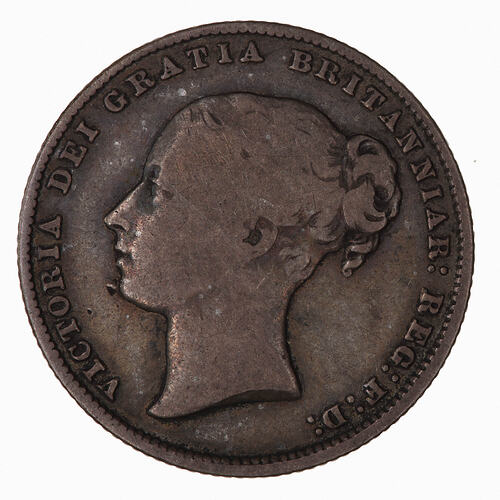 Head of the Queen facing left, ribbon in hair; around, VICTORIA DEI GRATIA BRITANNIAR: REG: F:D: