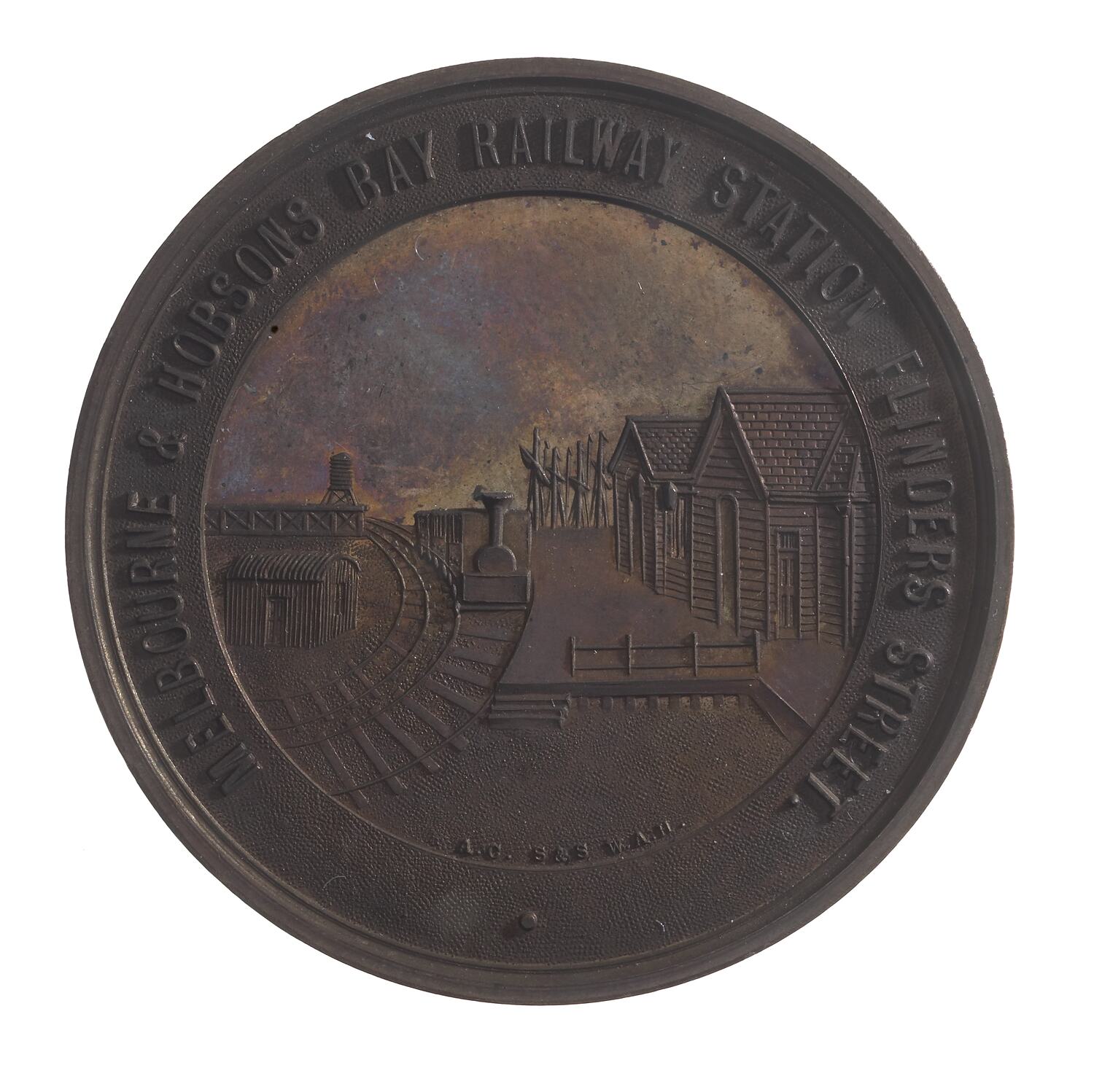 Obverse: MELBOURNE & HOBSONS BAY RAILWAY STATION FLINDERS STREET./A.C. S & S W.A.H. Reverse: TO COMMEMORATE THE OPENING OF THE FIRST STEAM RAILWAY IN AUSTRALIA MELBOURNE TO SANDRIDGE 12TH SEP 1854 AND THE CONSTRUCTION OF THE FIRST LOCOMOTIVE USED IN AUSTRALIA ALSO EARLY VICTORIAN RAILWAYS MELBOURNE TO GEELONG, 1857 MELBOURNE TO ST. KILDA, 1857 MELBOURNE TO WILLIAMSTOWN, 1859 MELBOURNE TO ESSENDON 1860