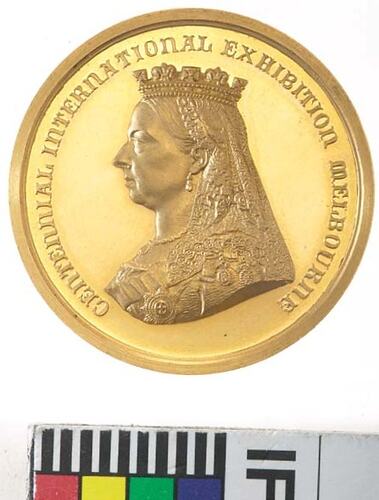 Crowned and veiled bust of Queen Victoria left; around, CENTENNIAL INTERNATIONAL EXHIBITION MELBOURNE