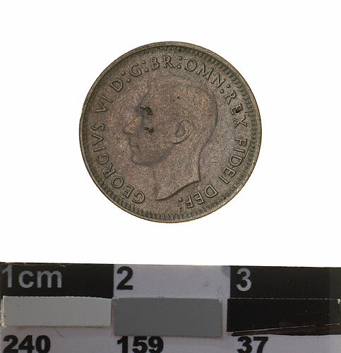 A silver coin (16 mm diameter with plain edge) featuring a bare head of George VI facing left; around, GEORGIVS VI D: G: BR: OMN: REX FIDEI DEF.; below bust in small lettering the artist's initials H.P.. The reverse features three ears of wheat held by a curved ribbon. Around above, AUSTRALIA; around below devided into two by the stalks of the wheat, THREE PENCE, above, across the middle of the coin the date devided into two by the ears, 1952. The artist's initials tucked into the first and last folds in the ribbon K G