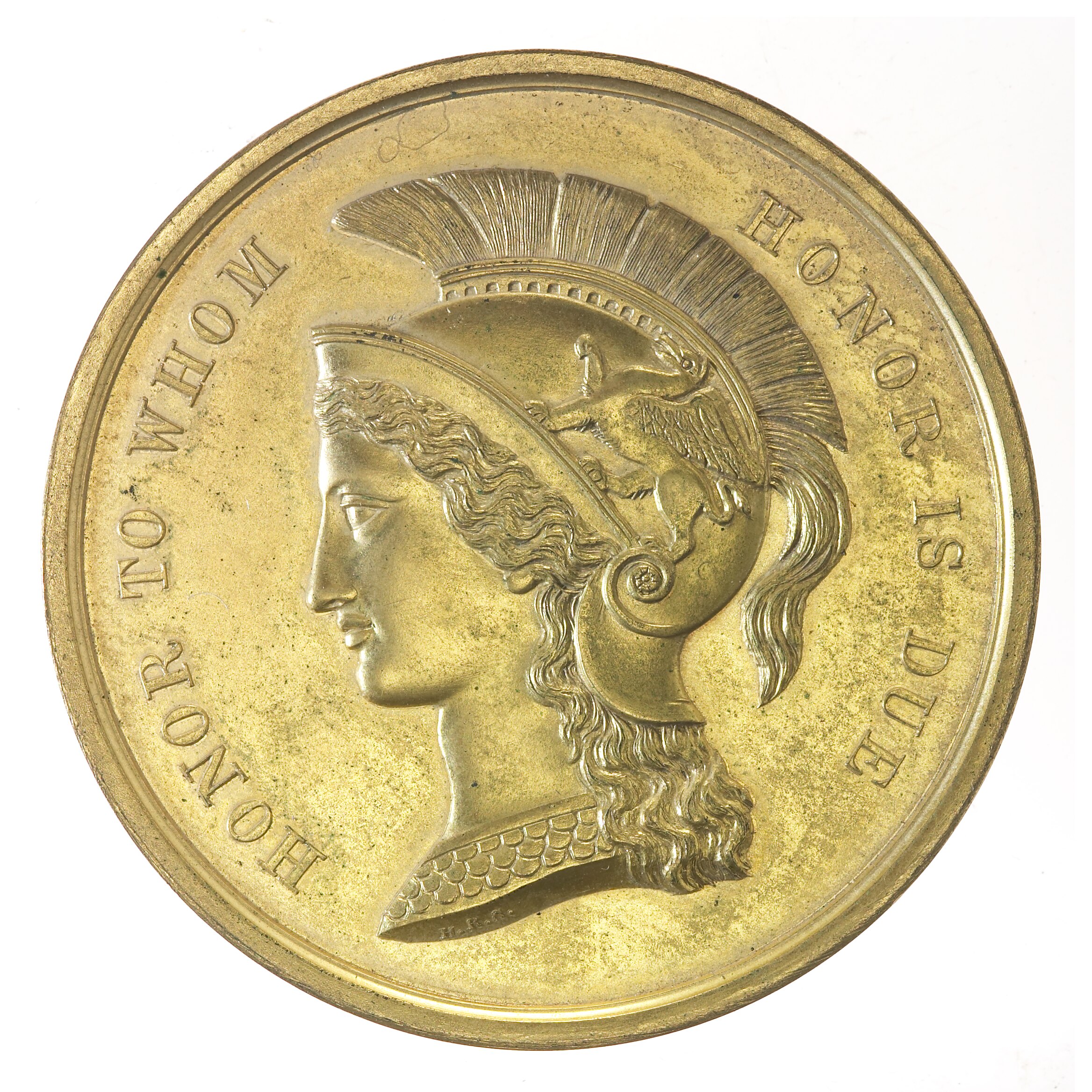 Bust of the Greek goddess Athena wearing plumed helmet with griffon facing left; around, HONOR TO WHOM HONOR IS DUE and, on truncation, the artist's initials, H. R. S.