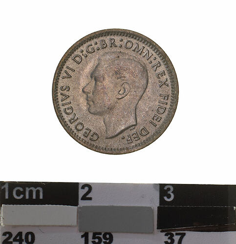 A silver coin (16 mm diameter with plain edge) featuring a bare head of George VI facing left; around, GEORGIVS VI D: G: BR: OMN: REX FIDEI DEF.; below bust in small lettering the artist's initials H.P.. The reverse features three ears of wheat held by a curved ribbon. Around above, AUSTRALIA; around below devided into two by the stalks of the wheat, THREE PENCE, above, across the middle of the coin the date devided into two by the ears, 1952. The artist's initials tucked into the first and last folds in the ribbon K G.