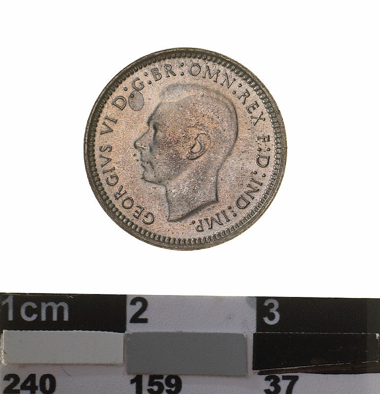 A silver coin (16 mm diameter with plain edge) featuring a bare head of George VI facing left; around, GEORGIVS VI D: G: BR: OMN: REX F: D: IND: IMP: ; below bust in small lettering the artist's initials H.P.. The reverse features three ears of wheat held by a curved ribbon. Around above, AUSTRALIA; around below devided into two by the stalks of the wheat, THREE PENCE, above, across the middle of the coin the date devided into two by the ears, 1948. The artist's initials tucked into the first and last bends in the ribbon K G.