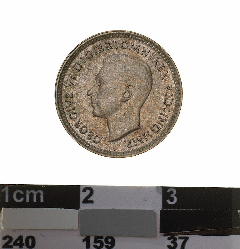 A silver coin (16 mm diameter with plain edge) featuring a bare head of George VI facing left; around, GEORGIVS VI D: G: BR: OMN: REX F: D: IND: IMP. ; below bust in small lettering the artist's initials H.P.. The reverse features three ears of wheat held by a curved ribbon. Around above, AUSTRALIA; around below devided into two by the stalks of the wheat, THREE PENCE, above, across the middle of the coin the date devided into two by the ears, 1944. The artist's initials tucked into the first and last bends in the ribbon K G. The mint mark S is below the right end of the ribbon above the final letter E of PENCE.
