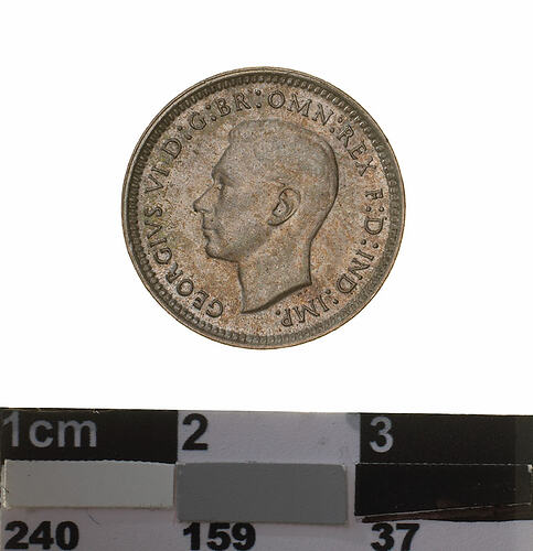 Obverse: GEORGIVS VI D: G: BR: OMN: REX F: D: IND: IMP. Reverse: THREE PENCE 1944 AUSTRALIA K G S