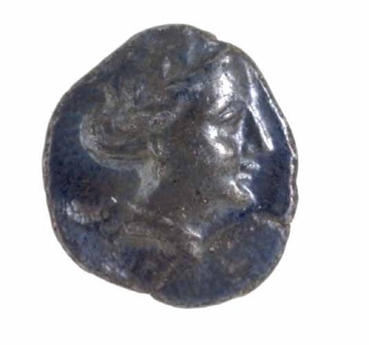 Head of nymph Histiaia facing right wearing earring and with vine-wreath