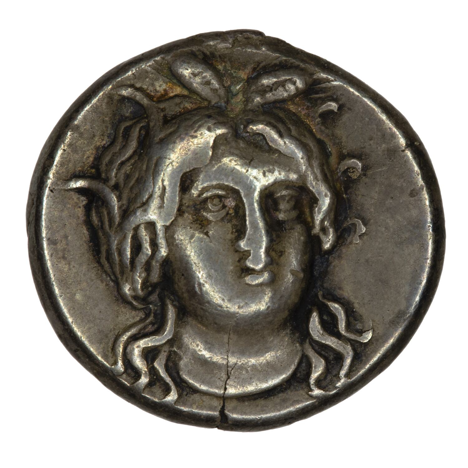 A silver 1/2 Stater coin issued by the town of Thebes in Boeotia, 221-197 BCE.
