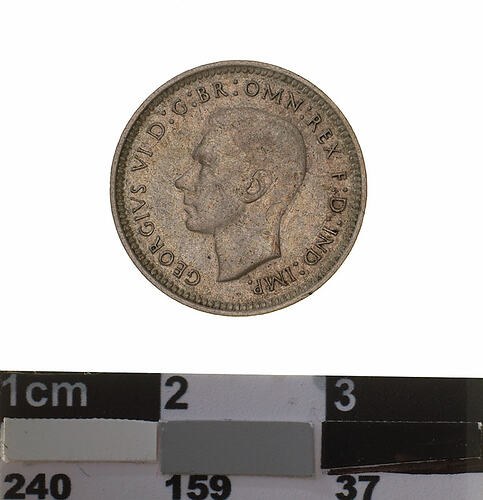 Obverse: GEORGIVS VI D: G: BR: OMN: REX F: D: IND: IMP Reverse: THREE PENCE 1943 AUSTRALIA K G S