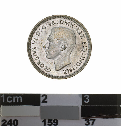 A silver coin (16 mm diameter with plain edge) featuring a bare head of George VI facing left; around, GEORGIVS VI D: G: BR: OMN: REX F: D: IND: IMP. ; below bust in small lettering the artist's initials H.P.. The reverse features three ears of wheat held by a curved ribbon. Around above, AUSTRALIA; around below devided into two by the stalks of the wheat, THREE PENCE, above, across the middle of the coin the date devided into two by the ears, 1942. The artist's initials tucked into the first and last bends in the ribbon K G. The mint mark S is below the right end of the ribbon above the final letter E of PENCE.
