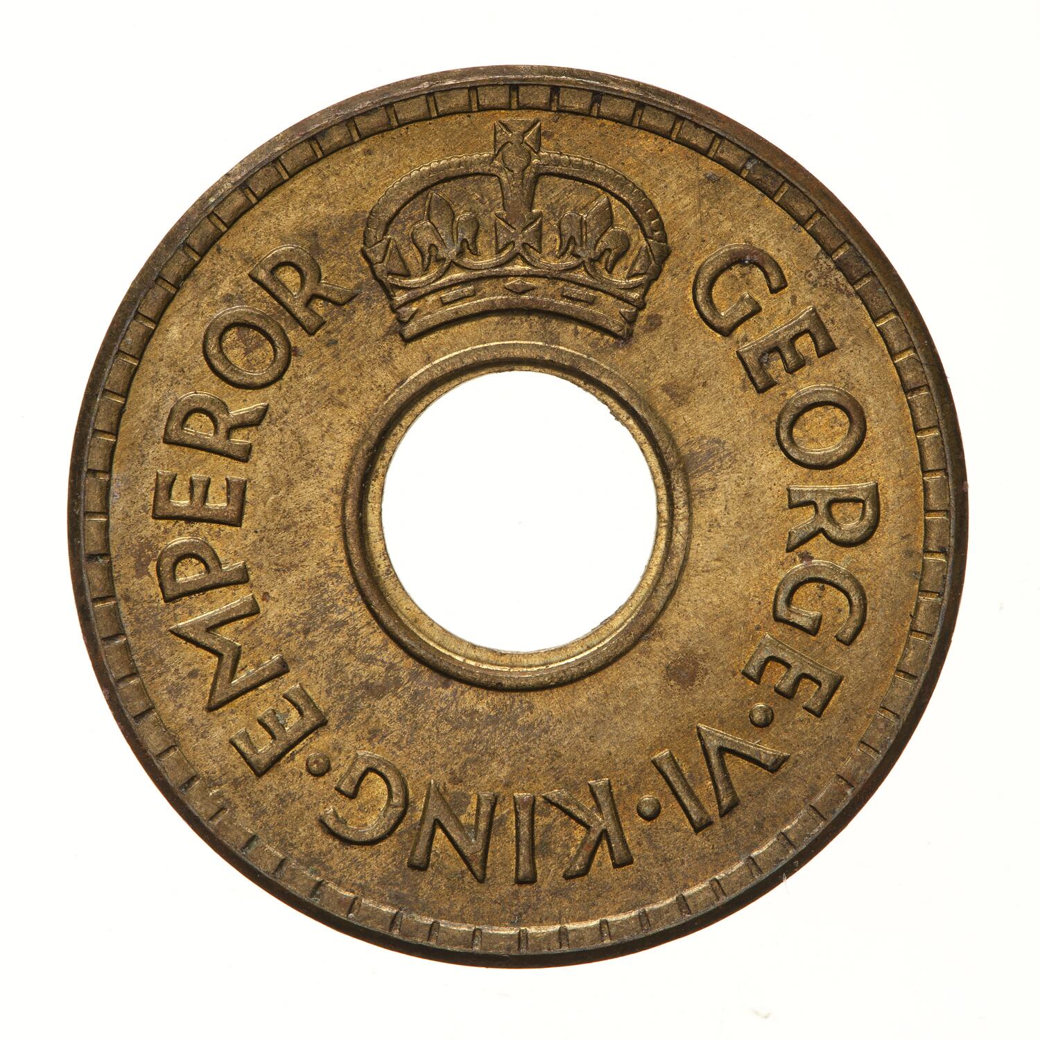 Above central hole, a crown; around, GEORGE VI KING EMPEROR