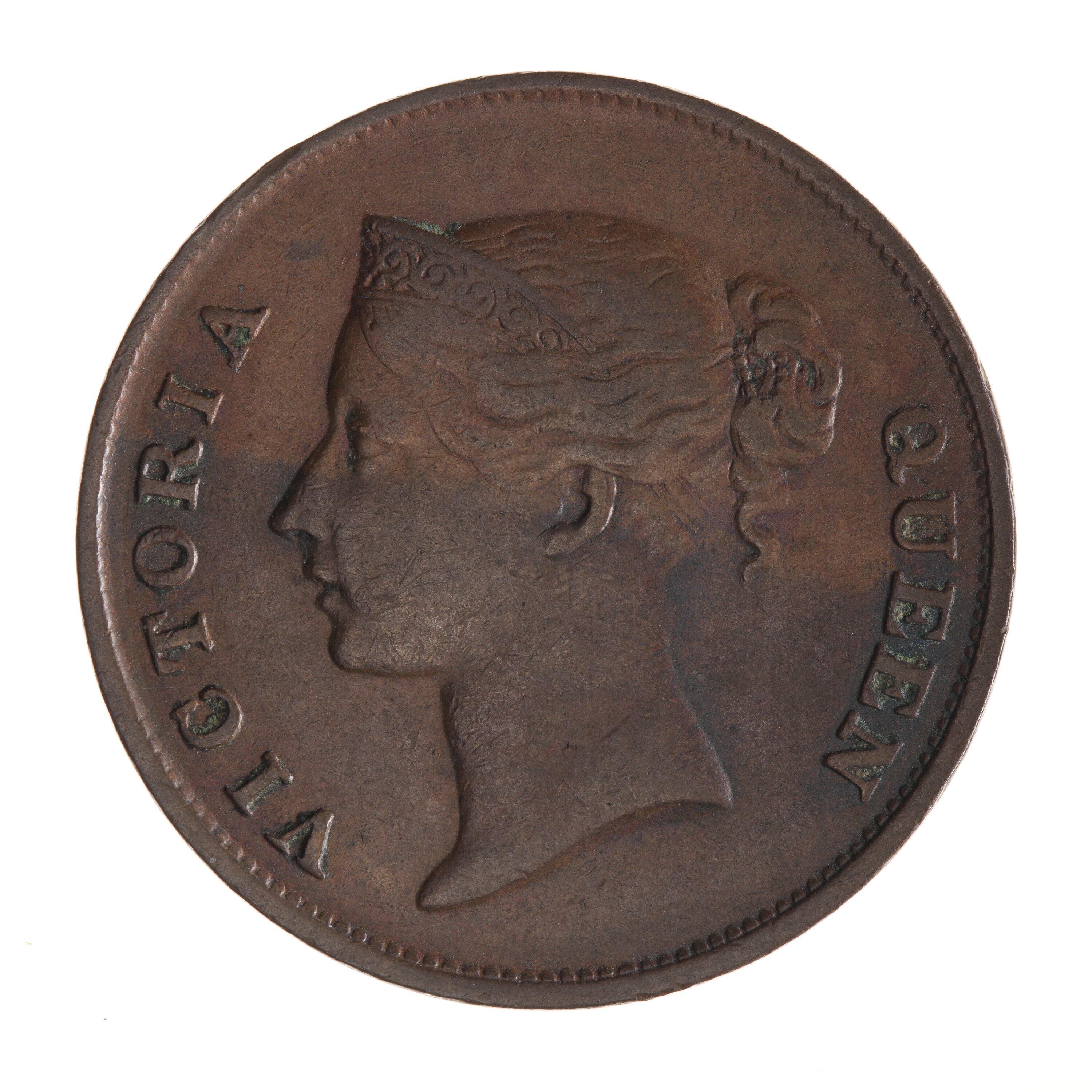 Head of the Queen wearing coronet or diadem ornamented with a scroll facing left; around, VICTORIA QUEEN. The ends of the coronet are connected by a band which is partly hidden by the hair. The hair is drawn into a knot decorated with beads behind the head