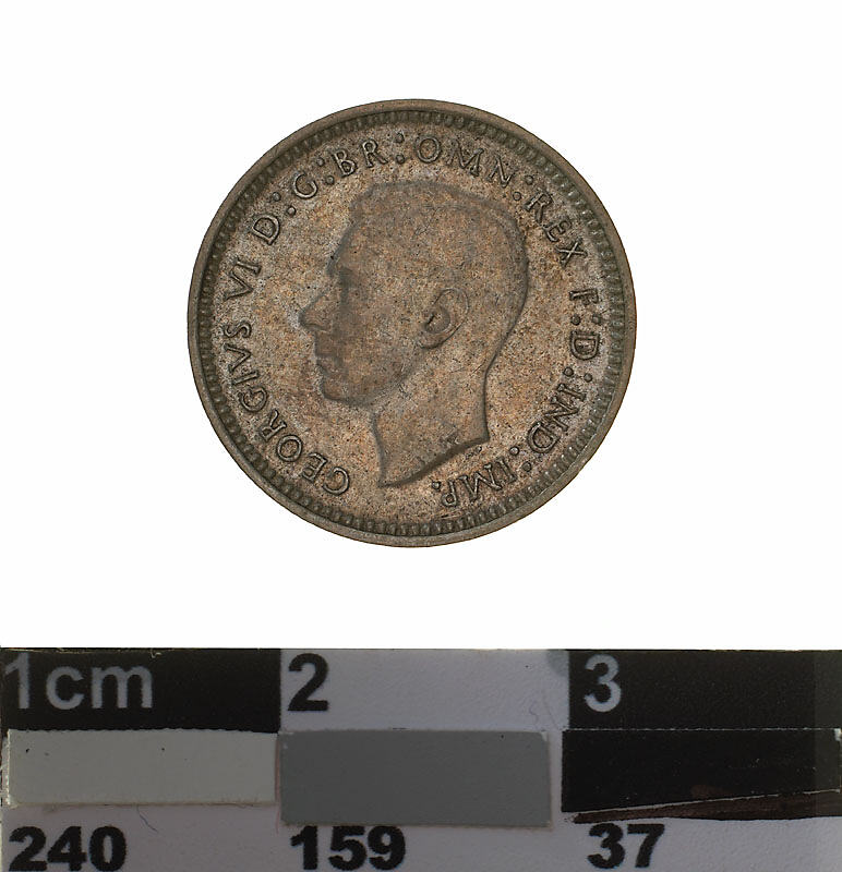 A silver coin (16 mm diameter with plain edge) featuring a bare head of George VI facing left; around, GEORGIVS VI D: G: BR: OMN: REX F: D: IND: IMP: ; below bust in small lettering the artist's initials H.P.. The reverse features three ears of wheat held by a curved ribbon. Around above, AUSTRALIA; around below devided into two by the stalks of the wheat, THREE PENCE, above, across the middle of the coin the date devided into two by the ears, 1941. The artist's initials tucked into the first and last bends in the ribbon K G.