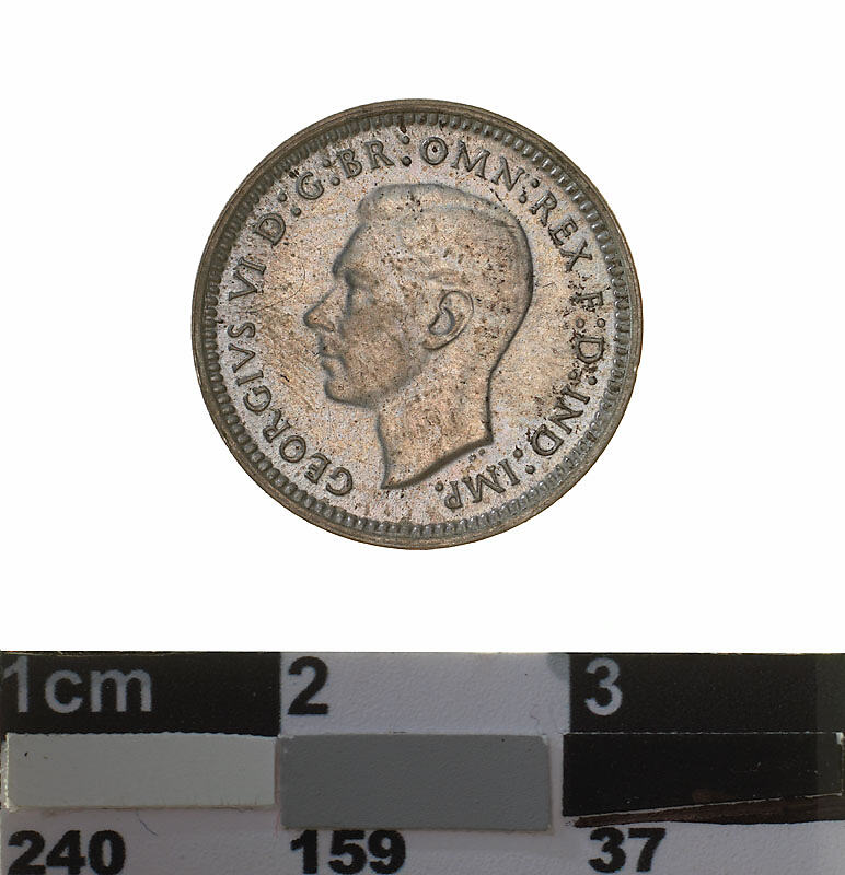 A silver coin (16 mm diameter with plain edge) featuring a bare head of George VI facing left; around, GEORGIVS VI D: G: BR: OMN: REX F: D: IND: IMP: ; below bust in small lettering the artist's initials H.P.. The reverse features three ears of wheat held by a curved ribbon. Around above, AUSTRALIA; around below devided into two by the stalks of the wheat, THREE PENCE, above, across the middle of the coin the date devided into two by the ears, 1940. The artist's initials tucked into the first and last bends in the ribbon K G.
