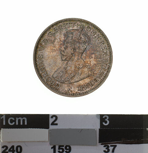A silver coin (16 mm diameter with plain edge) featuring a crowned and robed bust of George V facing left; around, GEORGIVS V D.G. BRITT: OMN: REX F.D. IND: IMP: ; below bust in small lettering the artist's initials B.M. The reverse features the Ensigns Armorial of the Commonwealth of Australia, as authorised by Royal Warrent 7th May 1908 - composed of a simple shield enclosing a cross of Saint George on which are five six-pointed stars, around the outside of which are six small escutcheons, i.e., small shields. The shield is supported by a kangaroo and an emu standing on a grassy mound. Above the shield a crest, the seven-pointed star of Federation on a wreath. Below on a ribbon the motto ADVANCE AUSTRALIA is inscribed. Around above, THREEPENCE and below, between arrow heads, the date, 1915.