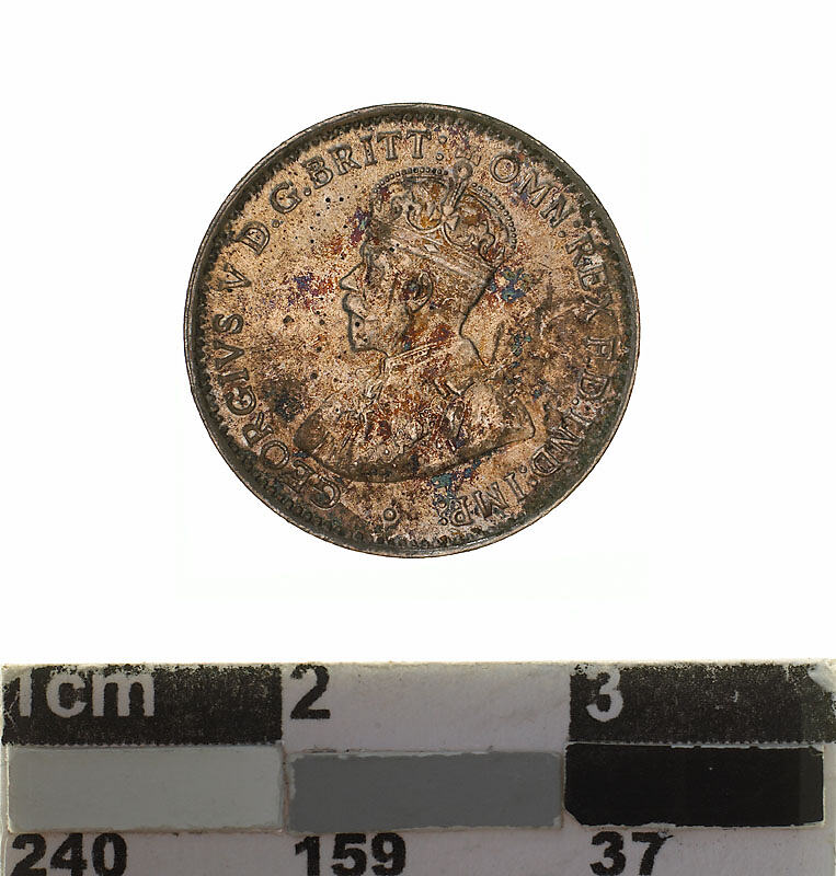 A silver coin (16 mm diameter with plain edge) featuring a crowned and robed bust of George V facing left; around, GEORGIVS V D.G. BRITT: OMN: REX F.D. IND: IMP: ; below bust in small lettering the artist's initials B.M. The reverse features the Ensigns Armorial of the Commonwealth of Australia, as authorised by Royal Warrent 7th May 1908 - composed of a simple shield enclosing a cross of Saint George on which are five six-pointed stars, around the outside of which are six small escutcheons, i.e., small shields. The shield is supported by a kangaroo and an emu standing on a grassy mound. Above the shield a crest, the seven-pointed star of Federation on a wreath. Below on a ribbon the motto ADVANCE AUSTRALIA is inscribed. Around above, THREEPENCE and below, between arrow heads, the date, 1911.