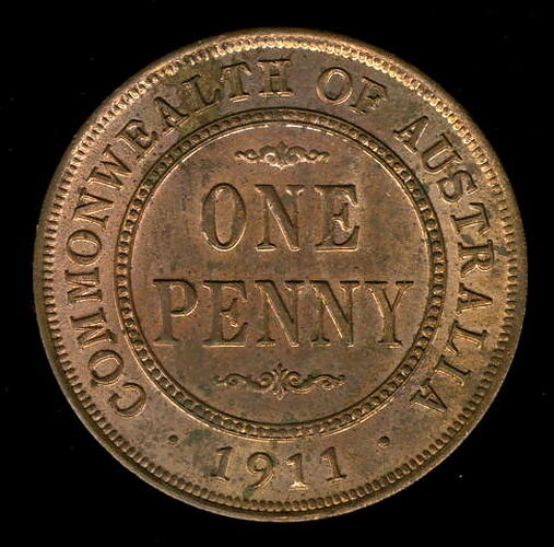 At centre within a circle of beads, the words ONE PENNY in two lines between upper and lower ornate scrolls; around the circle of beads, COMMONWEALTH OF AUSTRALIA . 1911 .