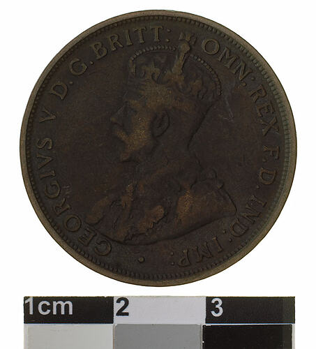 A bronze coin (30.8 mm diameter with plain edge) featuring a crowned and robed bust of George V facing left; around, GEORGIVS V D.G: BRITT: OMN: REX F.D. IND: IMP: ; below bust in small lettering the artist's initials B.M. The reverse features, within a circle of beads, the words ONE PENNY in two lines between upper and lower ornate scrolls; around the circle of beads, COMMONWEALTH OF AUSTRALIA . 1913 .