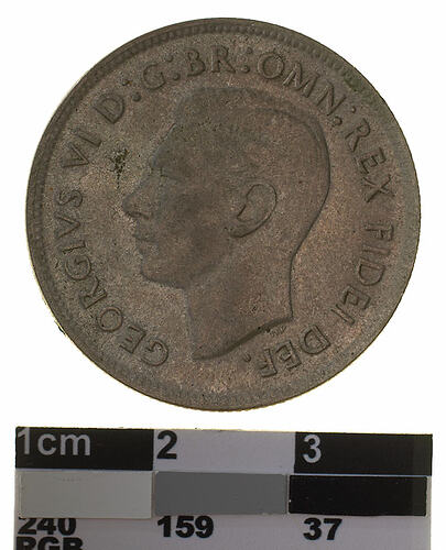 Bare head of George VI facing left; around, GEORGIVS VI D: G: BR: OMN: REX FIDEI DEF. ; below bust in small lettering the artist's initials H.P.