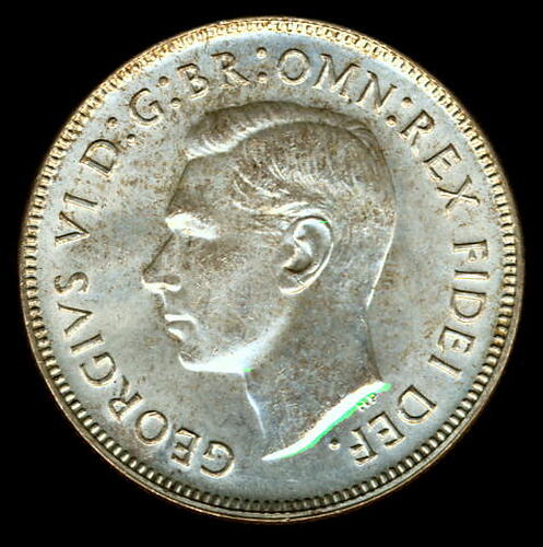 A silver coin (28 mm diameter with milled edge) featuring a bare head of George VI facing left; around, GEORGIVS VI D: G: BR: OMN: REX FIDEI DEF. ; below bust in small lettering the artist's initials H.P. The reverse is based on the Arms of the Commonwealth of Australia, as authorised by Royal Warrant 19 September 1912 - composed of a shield divided into six parts, each containing a representation of the badge of a State. The shield is supported by a kangaroo and an emu standing on a grassy mound accompanied by small branches of wattle. Above the shield is a crown. Around above, FLORIN between two seven pointed stars; and below, in the exergue, the date, 1951 curved below which, AUSTRALIA. The artist's initials KG are in the field above the back of the emu. See Notes Tab for details.