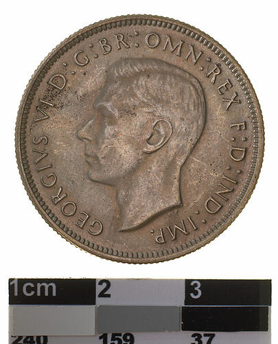 A silver coin (28 mm diameter with milled edge) featuring a bare head of George VI facing left; around, GEORGIVS VI D :G: BR: OMN: REX F .D. IND: IMP: ; below bust in small lettering the artist's initials H.P. The reverse features the Arms of the Commonwealth of Australia, as authorised by Royal Warrant 19 September 1912 - composed of a shield divided into six parts, each containing a representation of the badge of a State. The shield is supported by a kangaroo and an emu standing on a grassy mound accompanied by small branches of wattle. Above the shield is a crown. Around above, FLORIN between two seven pointed stars; and below, in the exergue, the date, 1945 curved below which, AUSTRALIA. The artist's initials KG are in the field above the back of the emu.