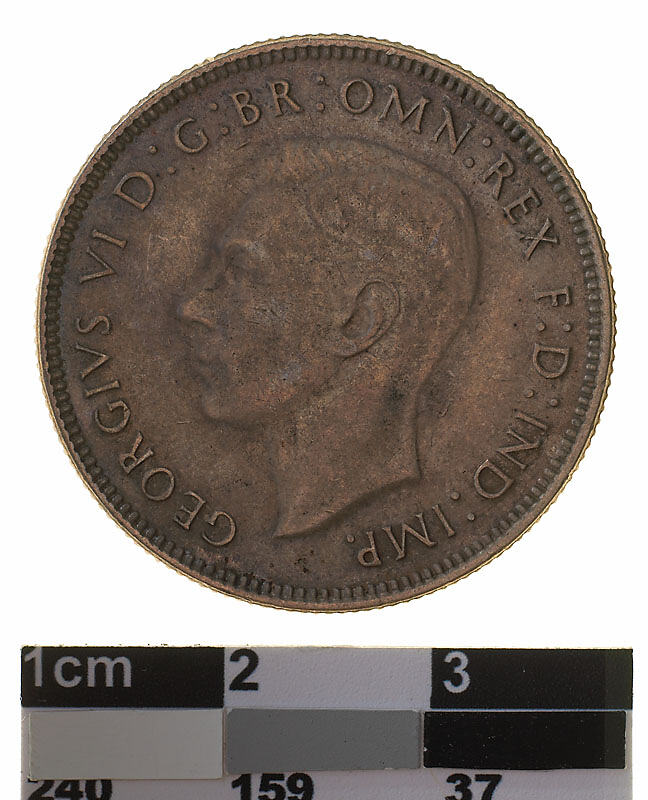 Bare head of George VI facing left; around, GEORGIVS VI D:G: BR: OMN: REX F:D: IND: IMP: ; below bust in small lettering the artist's initials H.P.