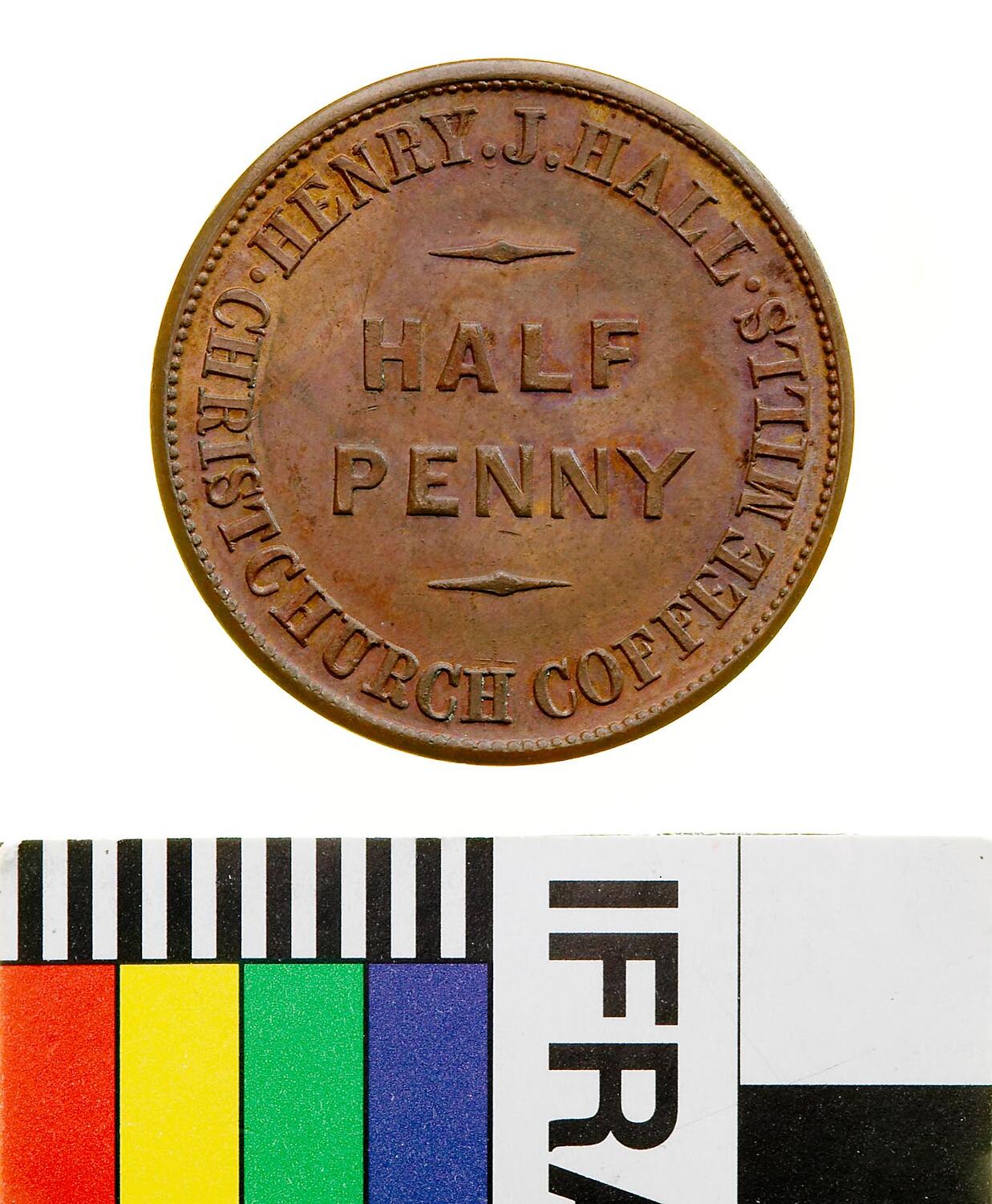 Across centre, HALF / PENNY around, HENRY J. HALL CHRISTCHURCH COFFEE MILLS