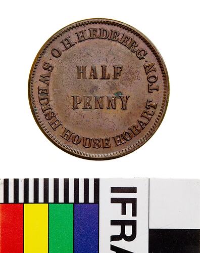 Hedburg was originally from Sweden but settled in Hobart in 1844 and became involved in the whaling industry. After the decline of the whaling industry in the mid-1850s, he opened a business as a produce merchant and commission agent in Argyle Street, Hobart, it is from this business his tokens were issued.