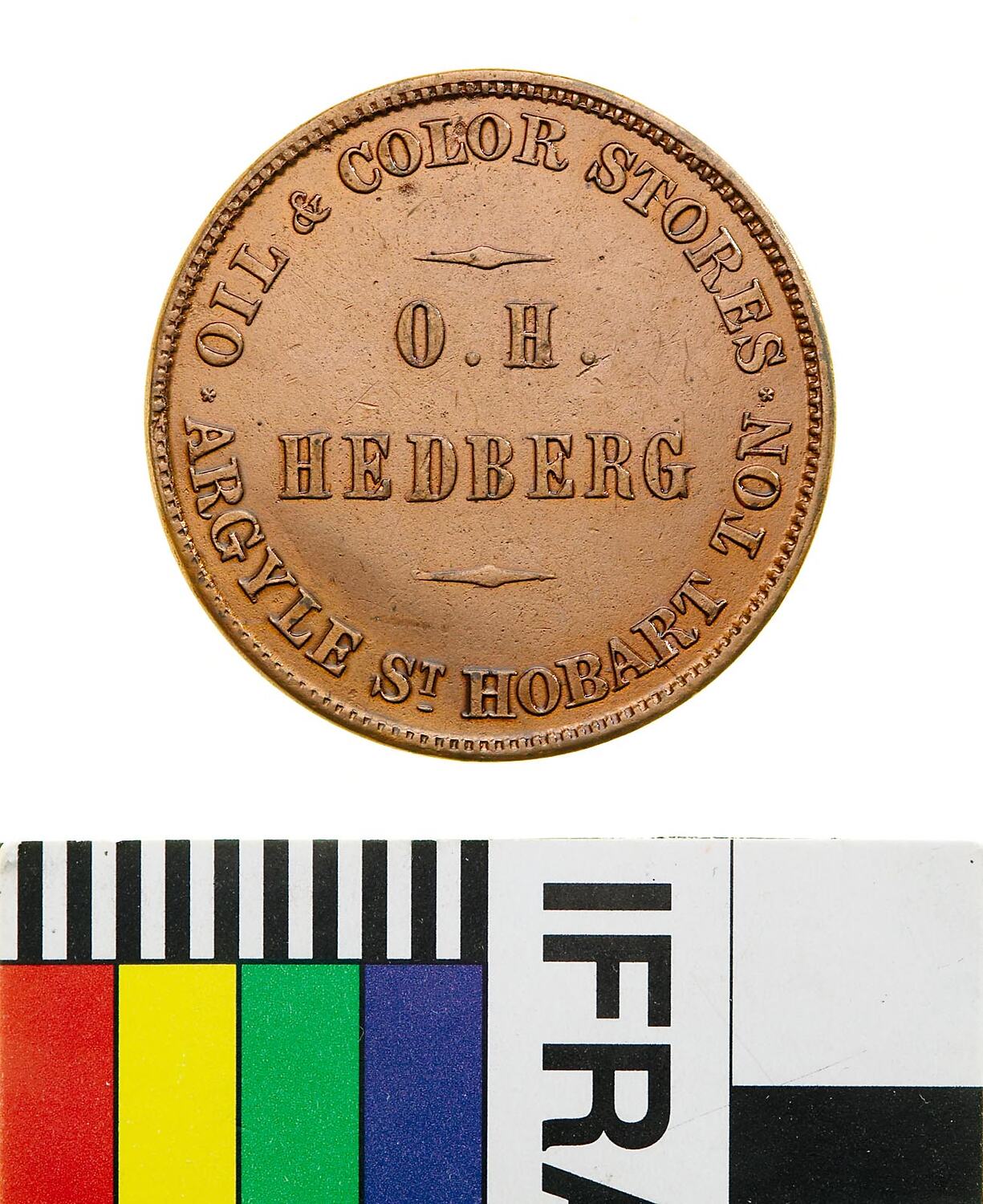 Copper Halfpenny token, minted by W.J. Taylor of London, circa 1860. Issued by O.H. Hedberg, owner of Oil & Colour Stores, in Hobart, Tasmania.