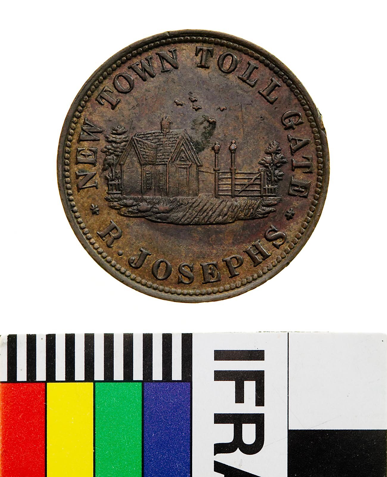 This copper Halfpenny mule token was minted by W.J. Taylor of London. It was issued by R. Josephs of Newtown, Tasmania, circa 1855. Transported to Australia in 1827 Josephs, gained his certificate of freedom in 1841. In 1852 he won the tender to operate the New Town toll gate for three years. It was during this time that he issued his trade tokens, known as 'Toll Gate' tokens, which would have enabled him to profit from giving change to people passing through his gate.