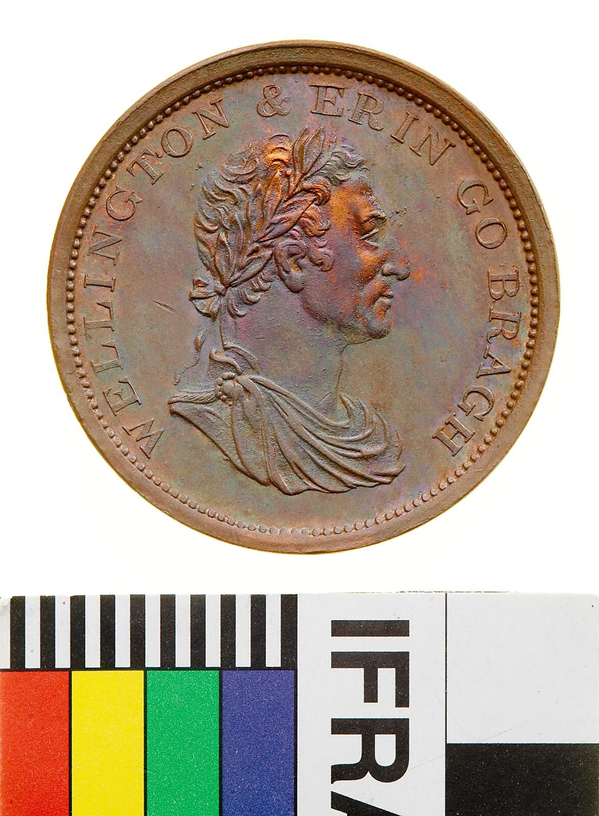 Bust of Wellington, laureate, facing right, around, WELLINGTON & ERIN GO BRAGH
