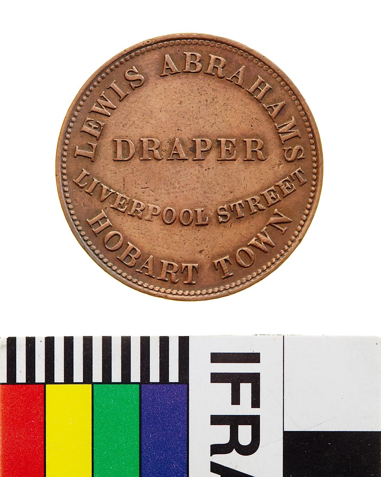 Copper Halfpenny Token, minted by W.J. Taylor, London. Issued by Lewis Abrahams, Drapers, Hobart, Tasmania, 1855. Lewis Abrahams was certainly living in Hobart Town in 1835, records show that he was in partnership with a H.C. Davis in Liverpool Street. He was married in the Jewish Synagogue in December 1855. It appears that Davis withdrew from the partnership and Abrahams carried on alone. He died in Hobart in 1860. Abrahams is mentioned in a number of documents held by the Hobart Hebrew Congregation, he is listed as a contributor to the fund for the construction of the Hobart Synagogue in 1844-1845, and as a 'seatholder' (financial member) of the Hobart Hebrew Congregation.