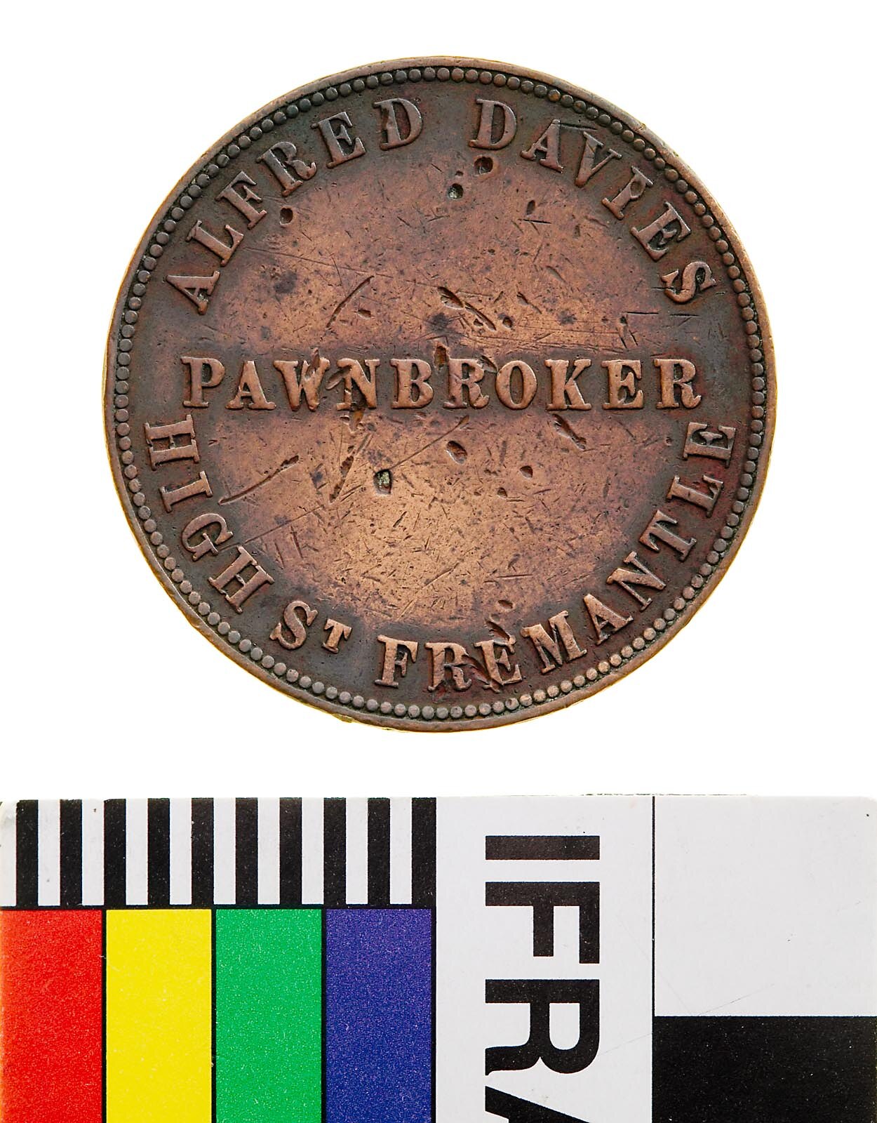 Obverse: ALFRED DAVIES PAWNBROKER HIGH ST FREMANTLE Reverse: WESTERN AUSTRALIA 1865
