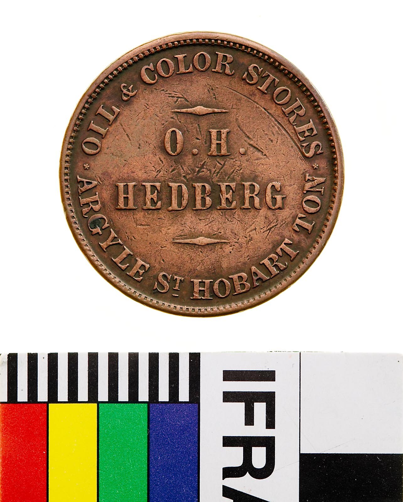 Copper Halfpenny token, minted by W.J. Taylor of London, circa 1860. Issued by O.H. Hedberg, owner of Oil & Colour Stores, in Hobart, Tasmania.