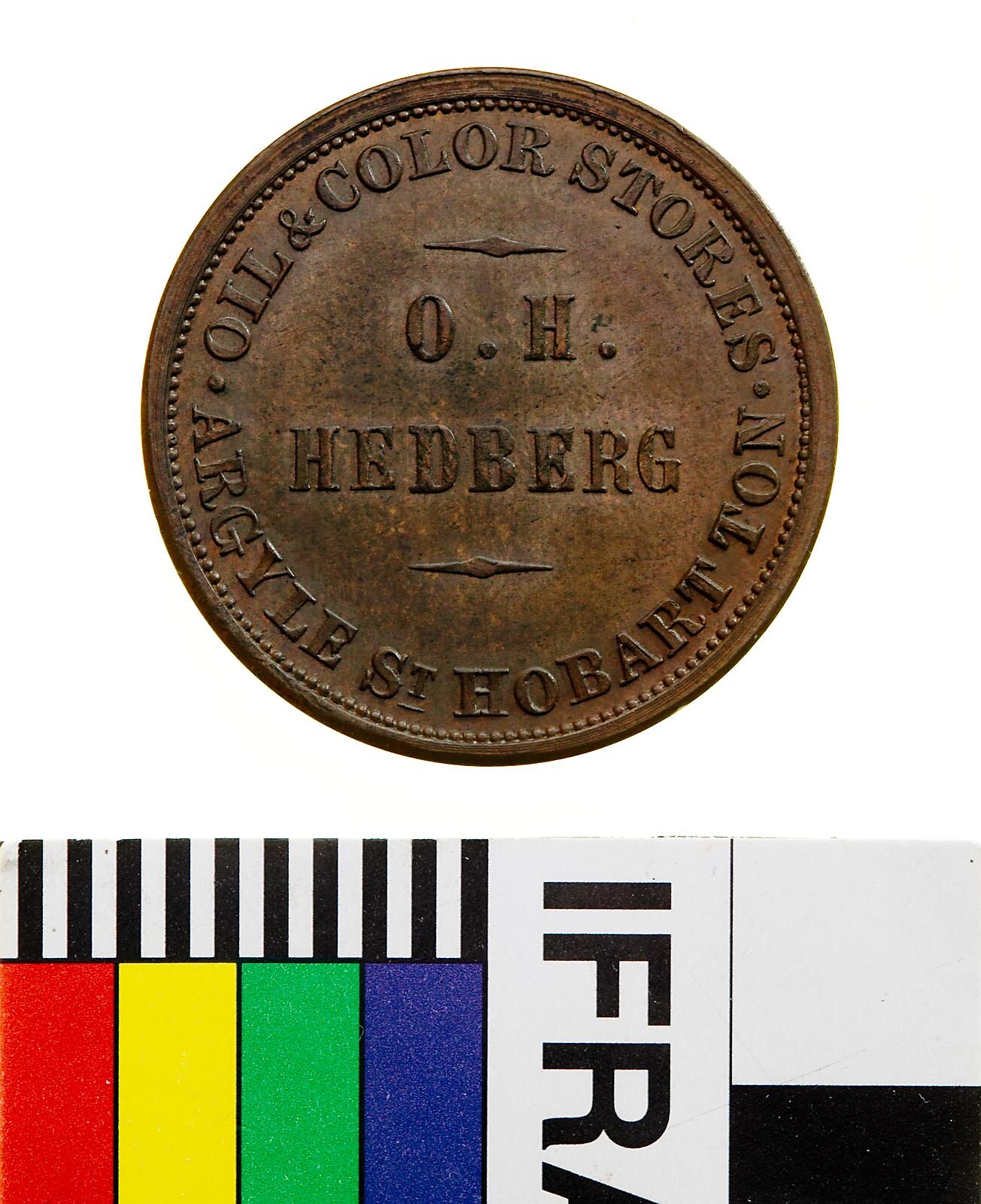 Hedburg was originally from Sweden but settled in Hobart in 1844 and became involved in the whaling industry. After the decline of the whaling industry in the mid-1850s, he opened a business as a produce merchant and commission agent in Argyle Street, Hobart, it is from this business his tokens were issued.