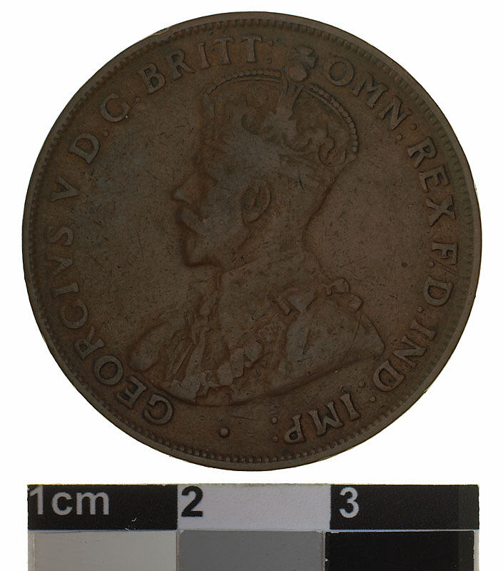 A bronze coin (30.8 mm diameter with plain edge) featuring a crowned and robed bust of George V facing left; around, GEORGIVS V D.G: BRITT: OMN: REX F.D. IND: IMP: ; below bust in small lettering the artist's initials B.M. The reverse features, within a circle of beads, the words ONE PENNY in two lines between upper and lower ornate scrolls; around the circle of beads, COMMONWEALTH OF AUSTRALIA . 1927 .