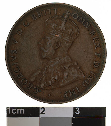 A bronze coin (30.8 mm diameter with plain edge) featuring a crowned and robed bust of George V facing left; around, GEORGIVS V D.G: BRITT: OMN: REX F.D. IND: IMP: ; below bust in small lettering the artist's initials B.M. The reverse features, within a circle of beads, the words ONE PENNY in two lines between upper and lower ornate scrolls; around the circle of beads, COMMONWEALTH OF AUSTRALIA . 1928 .