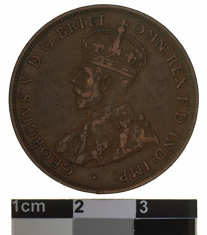A bronze coin (30.8 mm diameter with plain edge) featuring a crowned and robed bust of George V facing left; around, GEORGIVS V D.G: BRITT: OMN: REX F.D. IND: IMP: ; below bust in small lettering the artist's initials B.M. The reverse features, within a circle of beads, the words ONE PENNY in two lines between upper and lower ornate scrolls; around the circle of beads, COMMONWEALTH OF AUSTRALIA . 1926 .