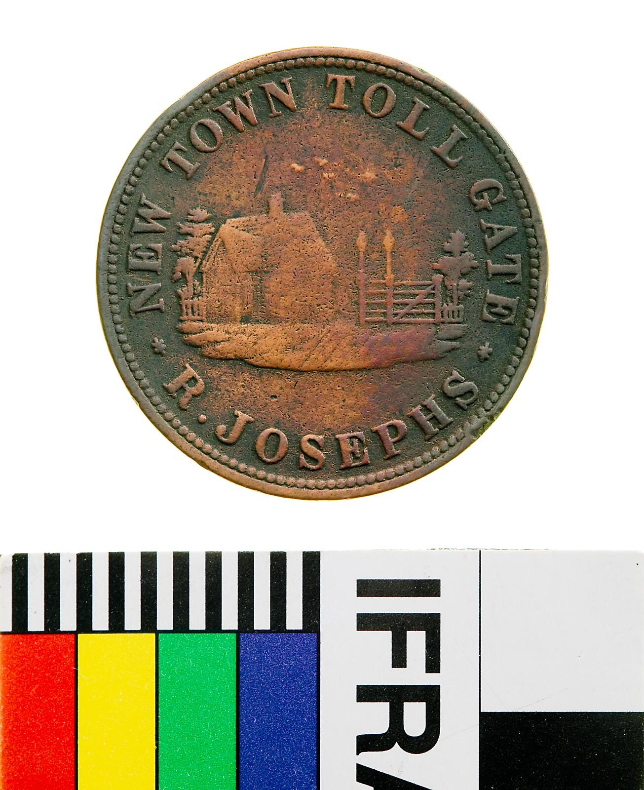 This copper Halfpenny mule token was minted by W.J. Taylor of London. It was issued by R. Josephs of Newtown, Tasmania, circa 1855. Transported to Australia in 1827 Josephs, gained his certificate of freedom in 1841. In 1852 he won the tender to operate the New Town toll gate for three years. It was during this time that he issued his trade tokens, known as 'Toll Gate' tokens, which would have enabled him to profit from giving change to people passing through his gate.