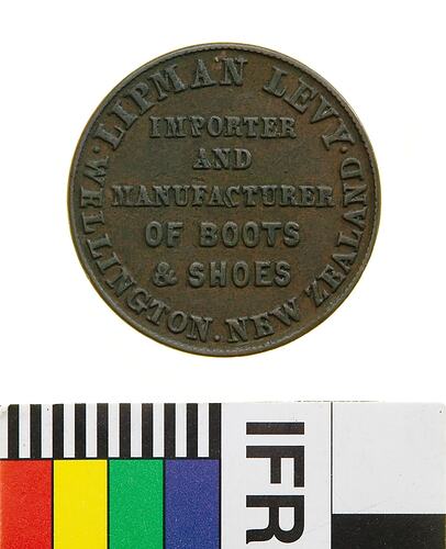 Obverse: LIPMAN LEVY IMPORTER AND MANUFACTURER OF BOOTS * SHOES WELLINGTON NEW ZEALAND Reverse: LEATHER & GRINDERY OF ALL DESCRIPTION THE TRADE SUPPLIED ONE PENNY TOKEN PAYABLE AT L. LEVY'S LAMBTON QUAY