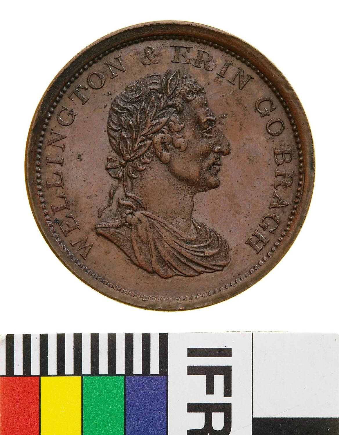 Bust of Wellington, laureate, facing right, around, WELLINGTON & ERIN GO BRAGH
