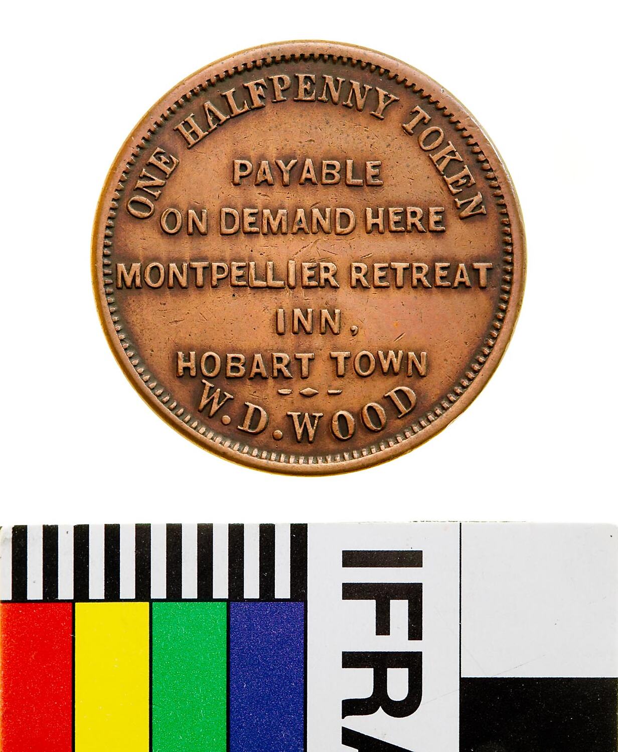 Legend in seven lines, ONE HALFPENNY TOKEN / PAYABLE / ON DEMAND HERE / MONTPELLIER RETREAT / INN, / HOBART TOWN / W.D. WOOD